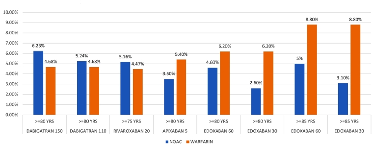 Meta-analyses of NOAC trial data have shown no interaction between age and their safety and efficacy although the very elderly patient subgroup is under-represented in the trials. Intracranial bleeding is lower with all NOACs compared with VKA. There is a significant interaction between age and increased extracranial major bleeding with both doses of dabigatran. No significant age interaction on rates of extracranial major bleeding was seen with apixaban, edoxaban or rivaroxaban. The absolute rates of major bleeding were lower with apixaban and edoxaban. All NOACs pooled together have higher GI bleeding compared to warfarin but apixaban is unique as it has similar rates of GI bleeding.
