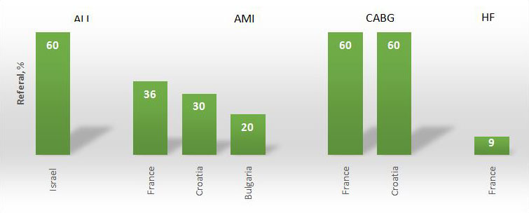 A majority of patients after acute myocardial infarction (AMI), percutaneous coronary intervention (PCI) or cardiac surgery are offered CR (high referral rates in countries such as France, Belgium and Bosnia and Herzegovina) but CR services to heart failure patients are severely underused across Europe, although there are some good practices (France, Belgium, Italy)