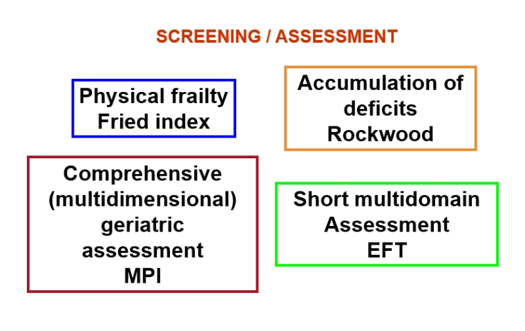 Frailty should be screened for and assessed using validated tools [6,7]. These tools investigate the various domains of frailty and may focus mainly on physical frailty, on the accumulation of deficits, or may perform a multidimensional assessment, even in a brief form [6] (Figure 2).