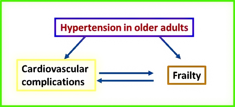 Hypertension is frequently found in patients aged 65 or older and represents a risk factor for various cardiovascular diseases such as heart failure, atrial fibrillation, stroke, kidney diseases and dementia. Moreover, hypertension in the elderly is associated with an accelerated decline in health status and frailty [1]. Frailty is defined as a condition of increased vulnerability to stressors leading to a reduced ability to combat potential acute negative events and reduced ability to maintain homeostasis. Frailty can lead to an increased risk of adverse health outcomes [2-6] (Figure 1).