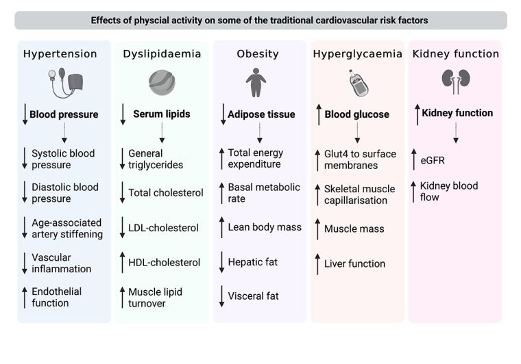 PA can lower systolic and diastolic blood pressure with a mean of 7 mmHg and 5 mmHg, respectively [14]. PA decreases age-associated stiffening of large elastic arteries and reduces inflammation, which collectively contribute to a decrease in blood pressure. The blood pressure-lowering effects of PA seem comparable to those of commonly used antihypertensive medications. Increasing intensity and duration of PA can reduce the need for medication [15].