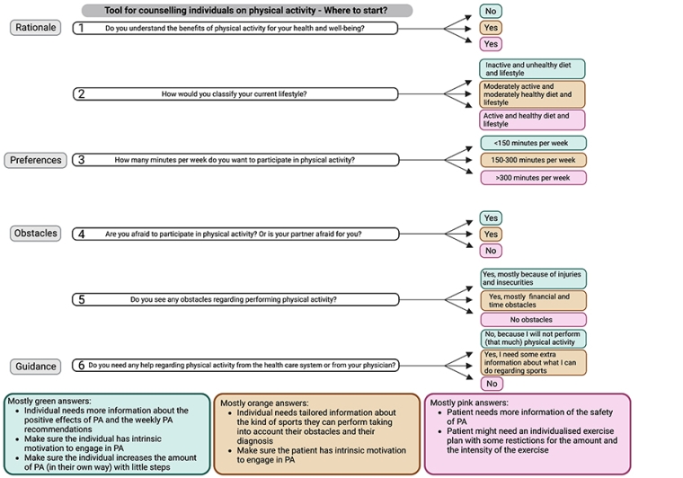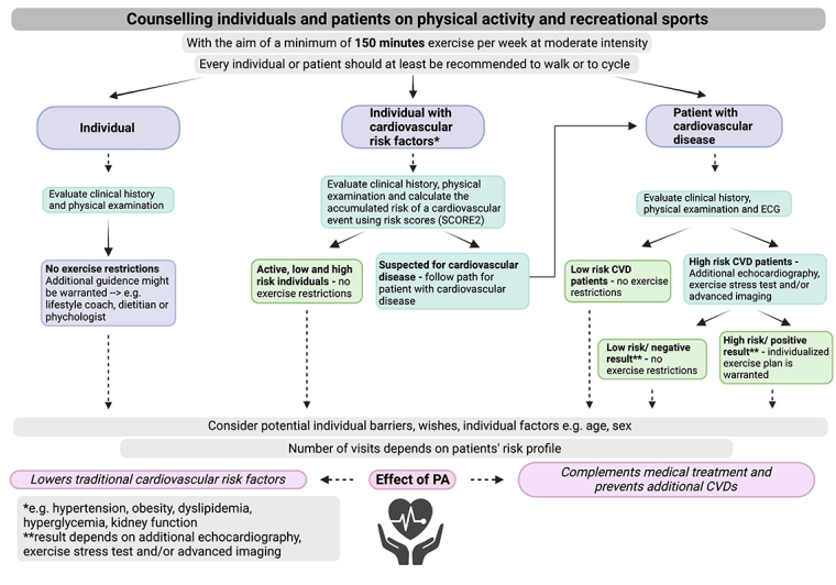 Encouraging individuals in the general population to perform PA and adopt a healthy lifestyle is important to prevent (cardiovascular) risk factors and associated disease and mortality. An evaluation of an individual’s clinical history and a physical examination by a general practitioner can help to identify the type of sports a patient can or cannot engage in. For example, if you have an individual with severe rheumatoid arthritis in the knees, it might be more appropriate to choose swimming, walking, or biking. To counsel individuals effectively, it is important to draw a distinction between those who are already active and those who are sedentary. A sedentary individual might need more help and a slower PA built-up scheme compared to an individual who is already active. Lifestyle coaches, dietitians and psychologists can provide extra guidance for patients who struggle to adopt a healthier lifestyle.