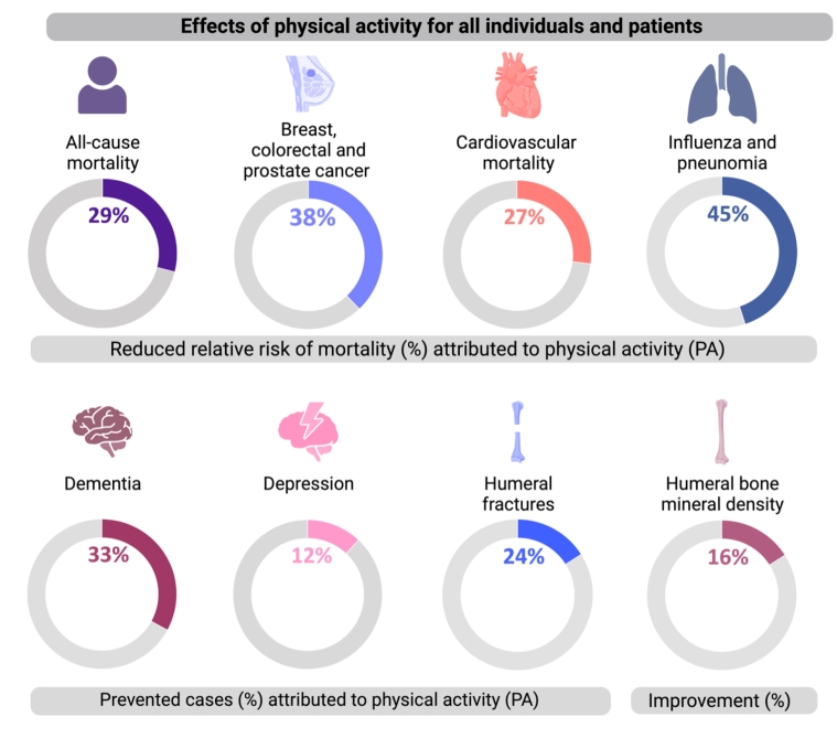 Exercise may complement the need for medication and contribute to a reduction in polypharmacy. In addition to the simplification of the management and the reduction in healthcare costs, this could be a motivation to increase PA levels by engaging in relatively simple PA such as walking or cycling, people can easily meet the recommended activity levels throughout the week.