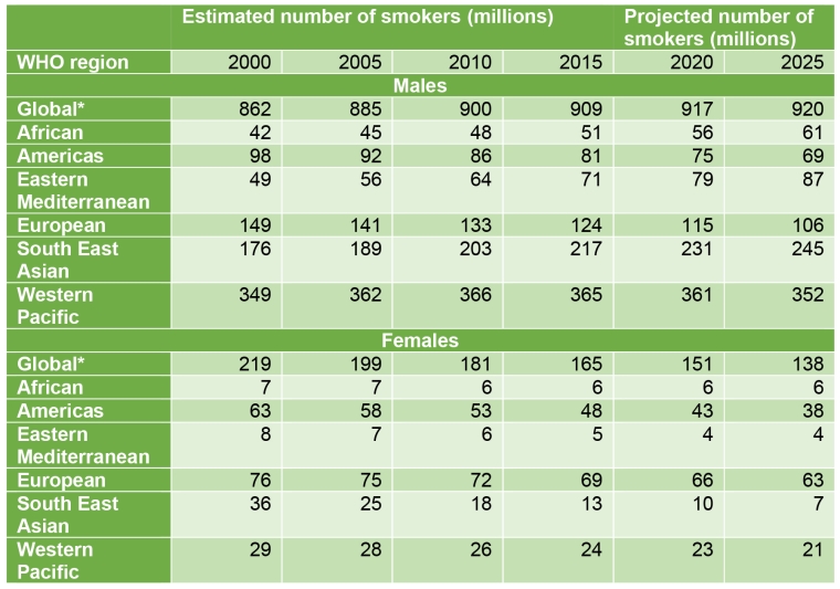 Tobacco causes an enormous health, social, economic, and developmental burden. Consistent with lower female smoking prevalence in many countries, the tobacco-related burden in women is lower than in men globally. However, recent increases in smoking prevalence among females, particularly in developing countries, might change this pattern.