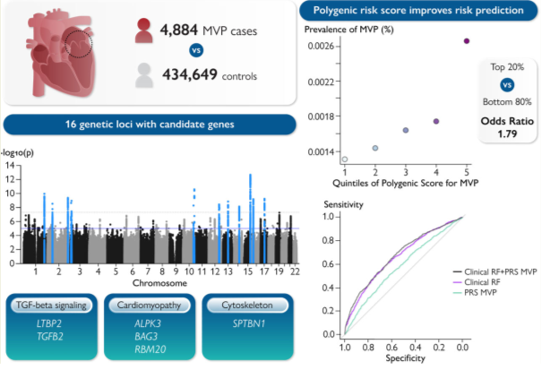 Graphical abstract: This study meta-analyzed 4884 mitral valve prolapse (MVP) cases versus 434 649 controls, and discovered 16 genetic loci associated with MVP. Downstream analyses implicated candidate genes involved in TGF-beta signalling, cardiomyopathy and the cytoskeleton. The results from the meta-analysis were used to calculate a polygenic risk score (PRS) to aid prediction of MVP. Adding the PRS to a model with age, sex and clinical risk factors improved MVP risk prediction. Abbreviations, MVP, mitral valve prolapse, p, p-value, PRS, polygenic risk score, RF, risk factors. Reproduced from Roselli et al.4, with permission.