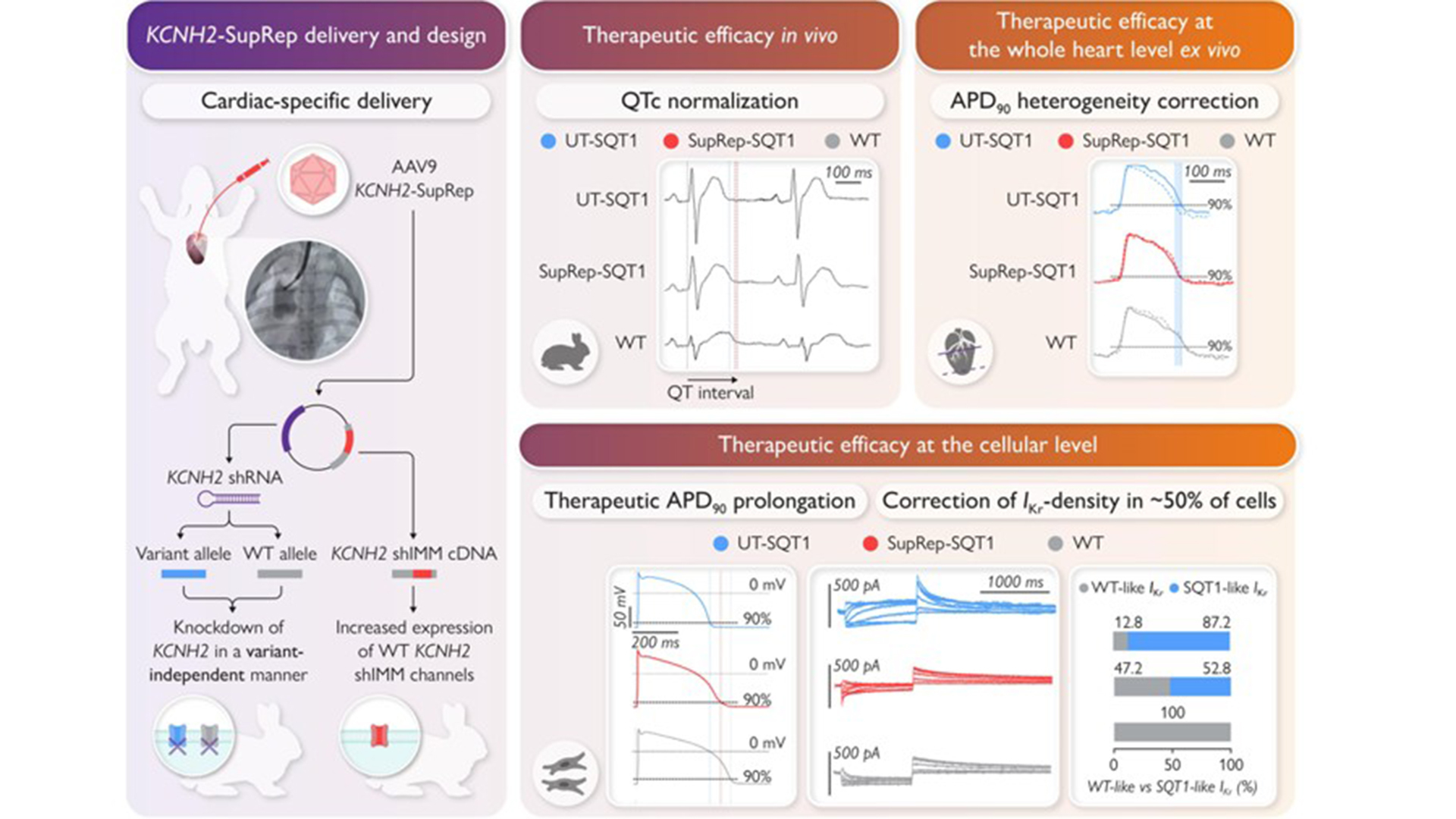 In this study, KCNH2-specific suppression-and-replacement (KCNH2-SupRep) gene therapy is employed to correct the pathologic phenotype in a transgenic rabbit model of SQT1. Since the genetic strategy suppresses the expression of the variant KCNH2 gene while at the same time, inducing expression of a wildtype KCNH2 gene, this study serves as a proof-of-concept for gene therapy not only of SQT1, but also the more common long QT syndrome where also the KCNH2 gene can be affected. T